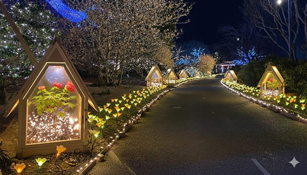 園内では、この貴重な冬ボタンが、雪国で見られる「雪囲い(雪吊り)」を施された姿で多数配置され、幻想的な光に照らし出されます。これは、他のイルミネーションイベントではまず見ることができない、植物園であるあしかがフラワーパークならではの、唯一無二の景観です。光のアートと生きた花の美しさが融合する、まさに「光の花の庭」の真骨頂と言えるでしょう。