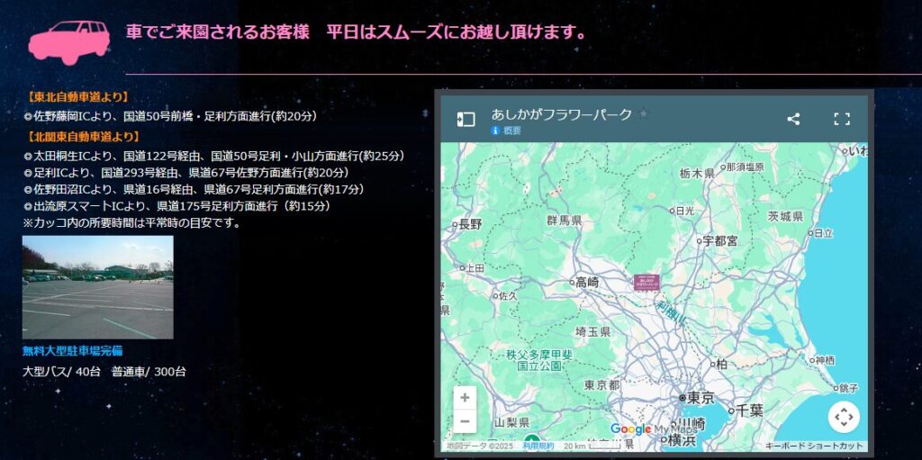 もちろん、車でのアクセスも可能です。栃木県足利市迫間町607という立地で、広大な駐車場も完備されています。