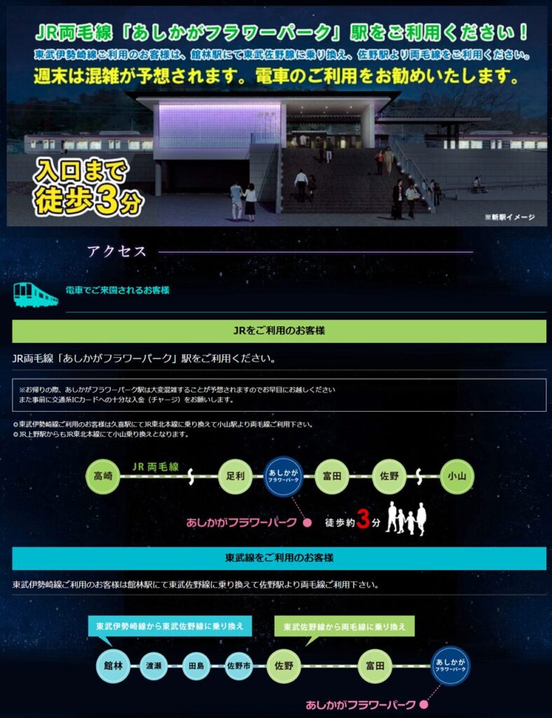 これほど大規模で有名な施設でありながら、アクセスが非常に便利な点も、あしかがフラワーパークの大きな魅力の一つです。