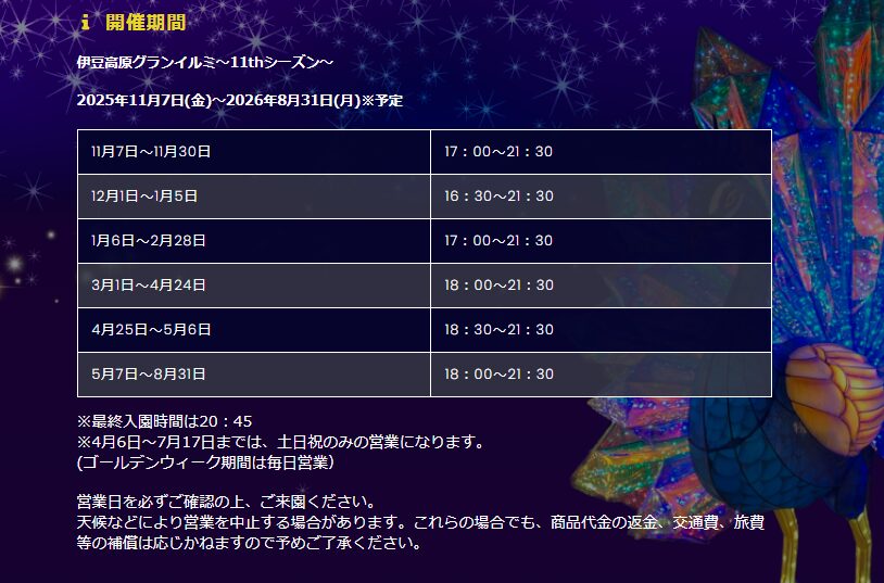 私が最も注意してほしいのが「営業時間」です。グランイルミは季節(日没時間)によってオープン時間が細かく変動します。
