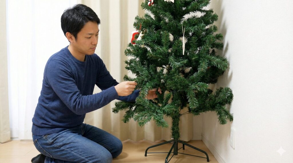 安価なツリー特有の「スカスカ感」が気になる場合も、この壁寄せテクニックは有効です。後ろの枝を前に集めることで、幹が見えなくなるほど密度が高まり、ワンランク上の高級ツリーのようなルックスを手に入れることができます。「安く買って高く見せる」最高の裏技です。