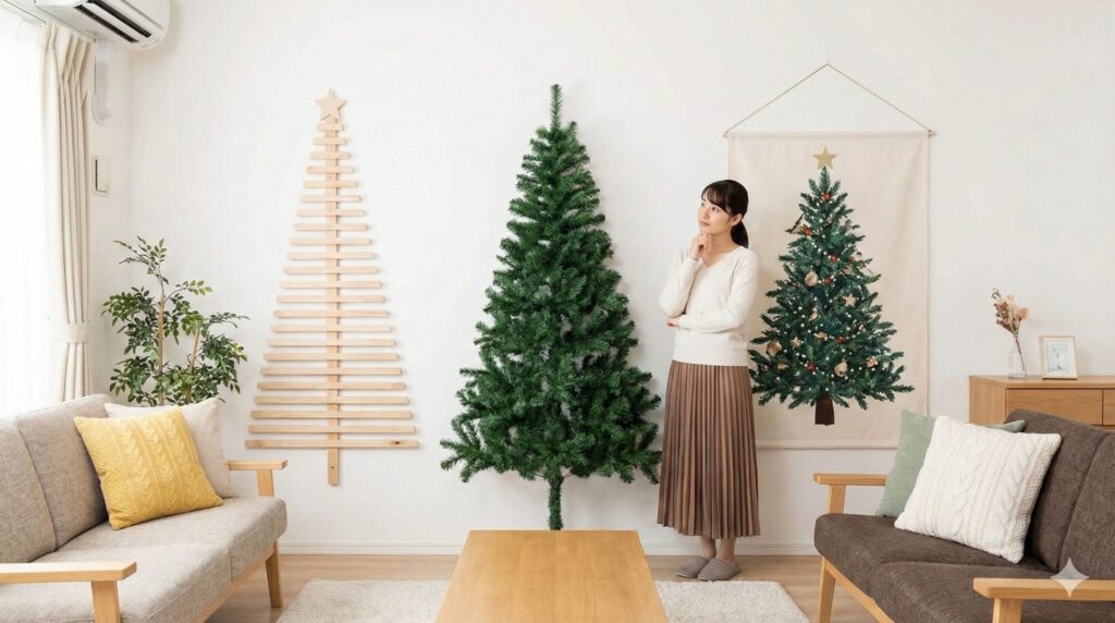 さらに省スペースを極限まで追求するなら、Francfranc(フランフラン)で毎年爆発的な人気を誇る「タペストリーツリー」も検討に値します。これは布にリアルなツリーの絵がプリントされたもので、壁に貼るだけで設置が完了する究極の2Dツリーです。