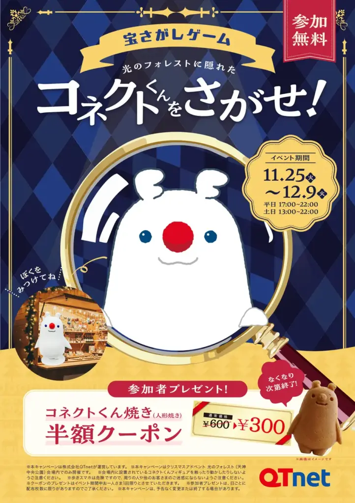 「光のフォレスト」を120%楽しむために欠かせないのが、QTnetの公式キャラクター「コネクトくん」のキャンペーンです。単なるマスコットキャラクターかと思いきや、実は「光の世界の妖精」というちゃんとした設定があるのをご存じでしたか?(よくトナカイと間違えられるそうですが、ツノのように見えるのはアンテナだそうです!)