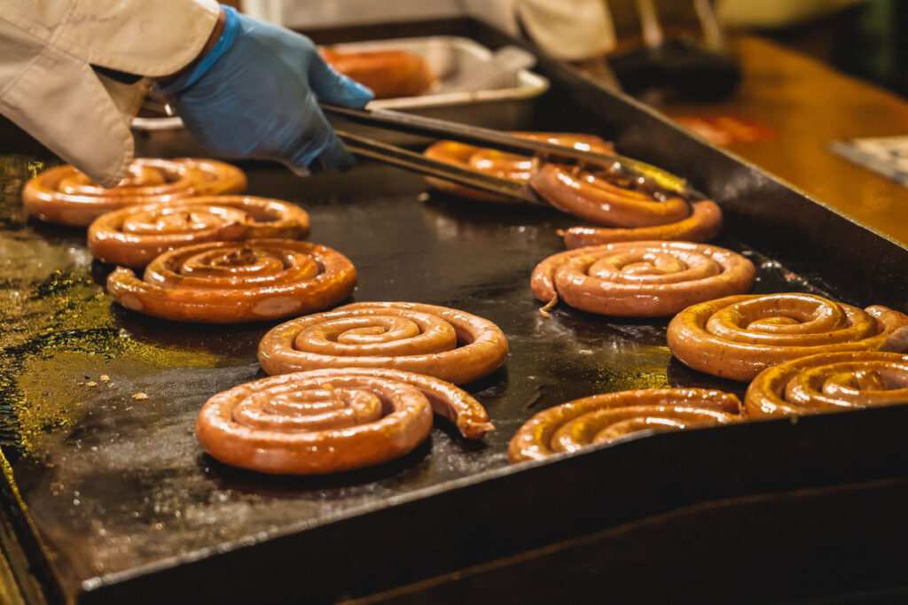 見た目のインパクト抜群の渦巻き状ソーセージ(約1,400円)。注文を受けてから鉄板で焼いてくれるので、熱々でパリッとした食感と溢れる肉汁がたまりません。