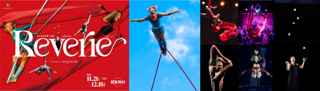 「無料のショーだから、大道芸のような軽い感じかな?」と思ったら大間違い。世界で活躍するプロのパフォーマーたちによる、本格的な「クリスマスサーカス Reverie(レヴェリー)」が上演されます。エアリアルシルク(空中演技)や、超人的な軟体芸(コントーション)、ジャグリングなど、息をのむようなパフォーマンスの連続です。