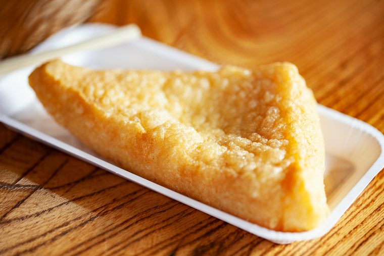 手のひらサイズの巨大な三角形の油揚げ。外はカリッと香ばしく、中は驚くほど肉厚でふっくらジューシー。